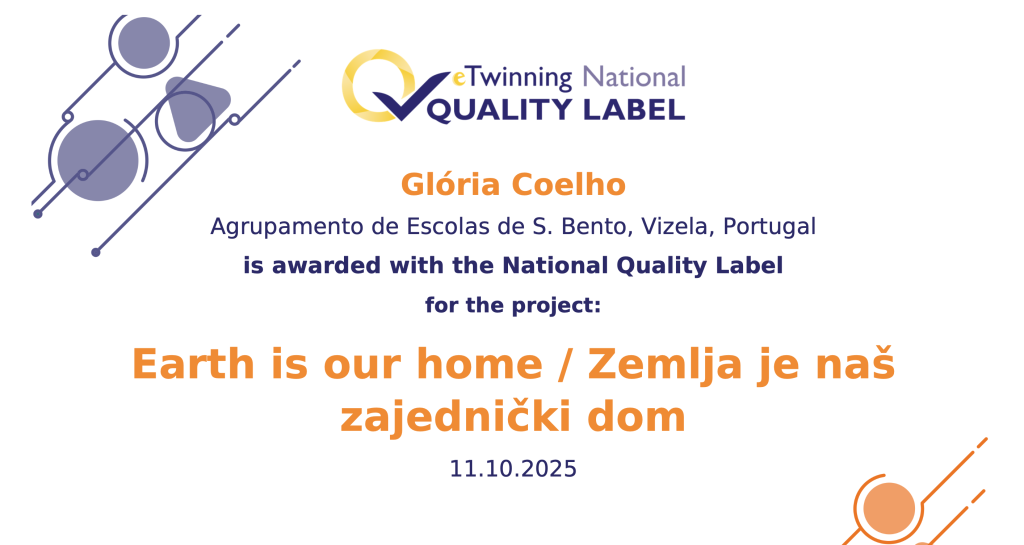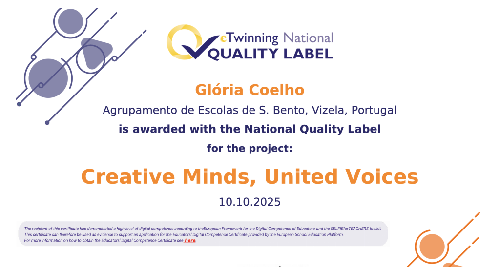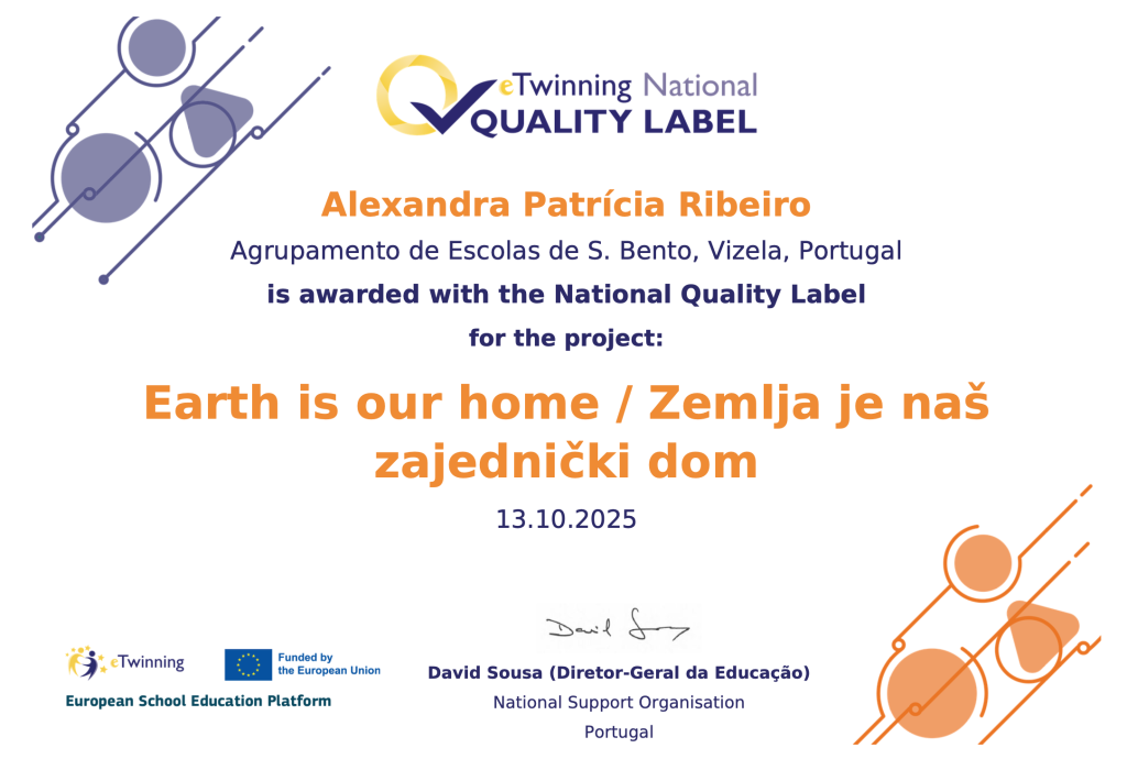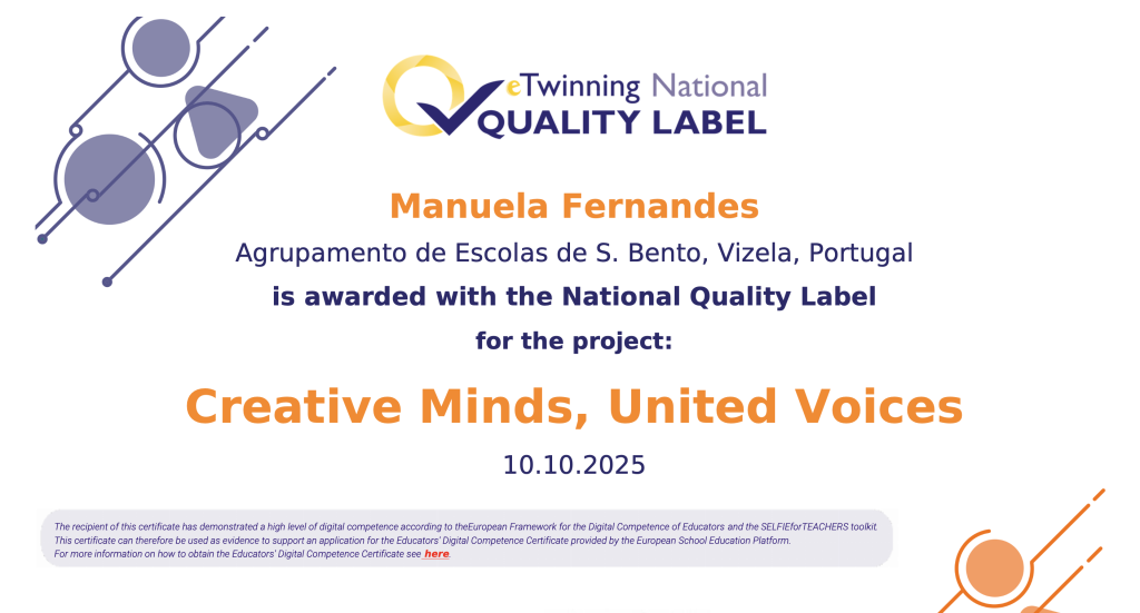 Os Projetos “Creative Minds, United Voices” e “Earth is our home” foram distinguidos com o prestigiado selo “eTwinning National Quality Label”, reconhecendo a excelência em práticas pedagógicas digitais e interculturais.