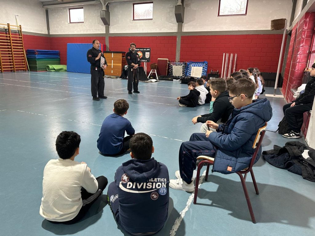 A atividade contou com a colaboração da Associação de Artes Marciais de Vizela – Alex Ryu Jitsu e a orientação do Mestre Paulo Ribeiro e a colaboração do instrutor monitor César Ribeiro que, gentilmente, se deslocaram à escola para realizar a sessão. Com uma abordagem didática e segura, o Mestre apresentou as características e benefícios desta arte, destacando valores fundamentais como o respeito mútuo, a disciplina e o autocontrolo.