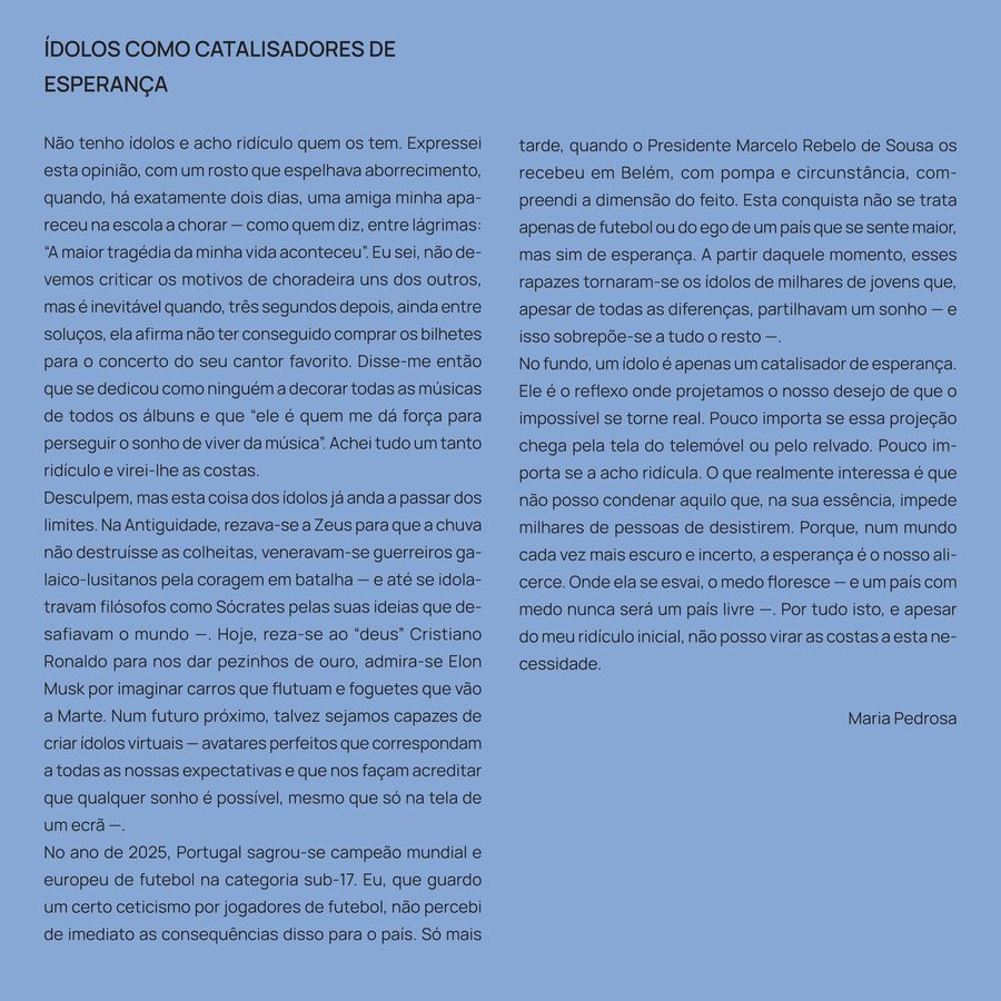 A aluna Inês Pedrosa do 11A venceu o Concurso de Crónica da 9|Revista de Guimarães Júnior – ídolos – edição 2026, na categoria de “Cronista Graúdo” (10.º – 12.º ano), com a crónica “ídolos como catalisadores de esperança”.